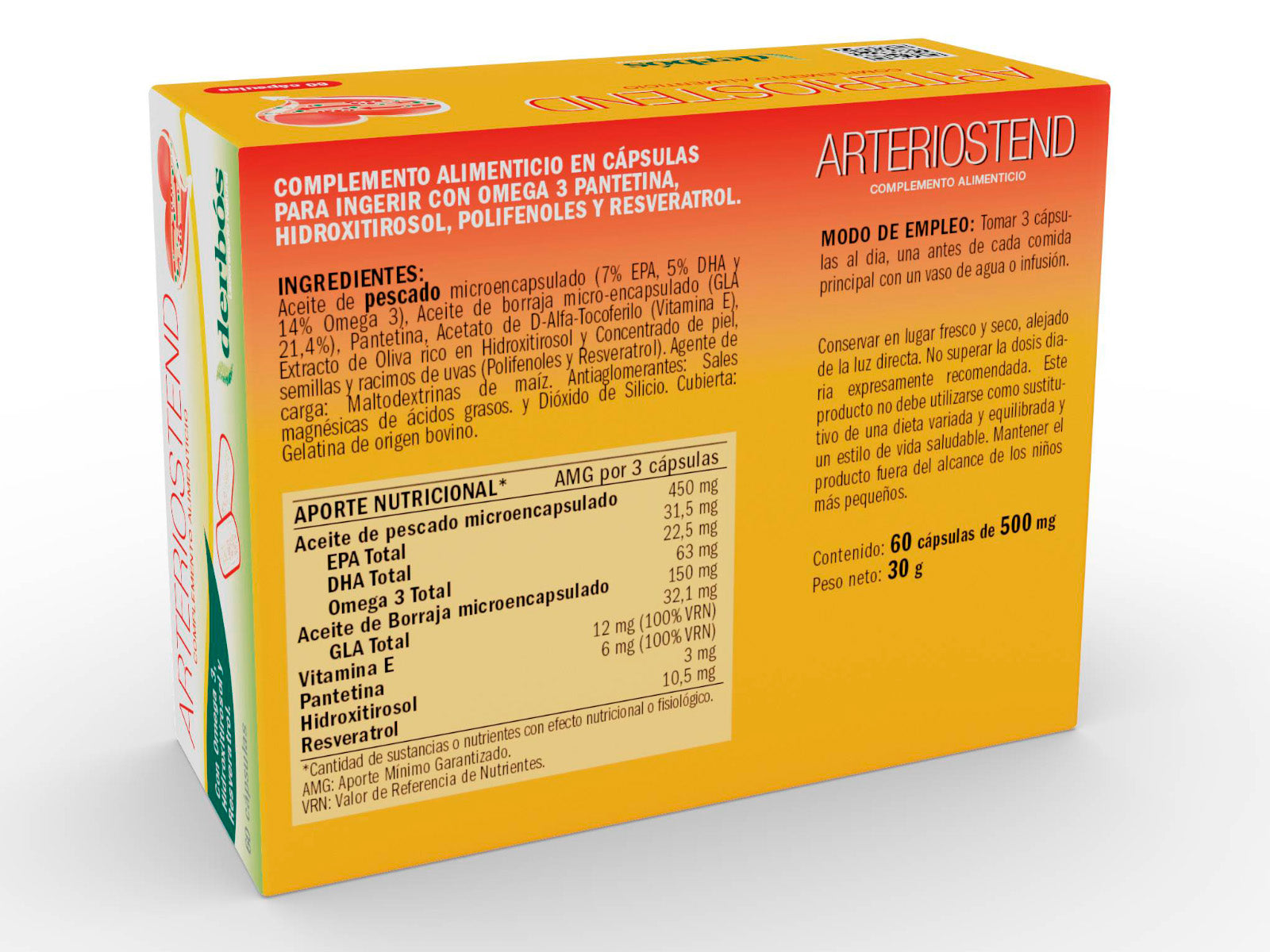 Aceite de pescado microencapsulado (7% EPA, 5% DHA y 14% Omega 3), Aceite de borraja micro-encapsulado (GLA 21,4%), Pantetina, Acetato de D-Alfa-Tocoferilo (Vitamina E), Extracto de Oliva rico en Hidroxitirosol y Concentrado de piel, semillas y racimos de uvas (Polifenoles y Resveratrol). Agente de carga: Maltodextrinas de maíz. Antiaglomerantes: Sales magnésicas de ácidos grasos, y Dióxido de Silicio. Cubierta: Gelatina de origen bovino.