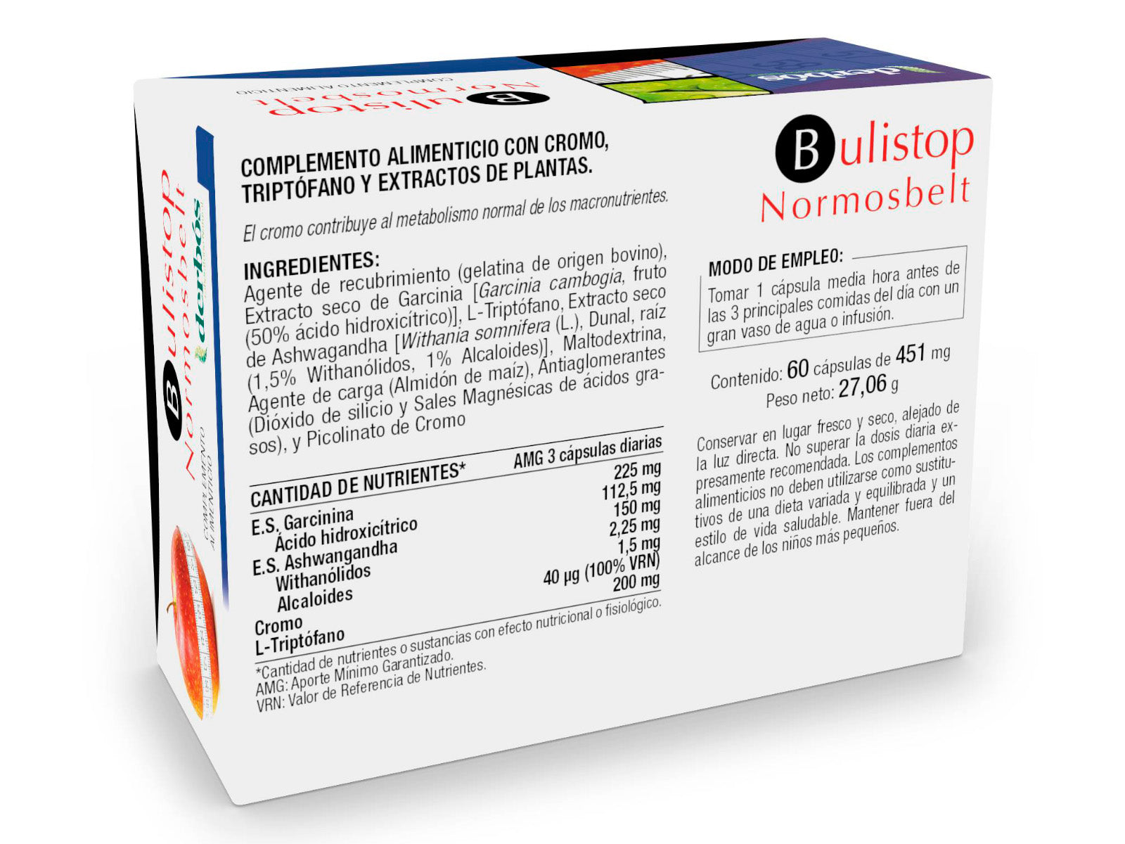 Agente de recubrimiento (gelatina de origen bovino), Extracto seco de Garcinia [Garcinia cambogia, fruto (50% ácido hidroxicítrico)], L-Triptófano, Extracto seco de Ashwagandha [Withania somnifera (L.) Dunal, raíz (1,5% Withanólidos, 1% Alcaloides)], Maltodextrina, Agente de carga (Almidón de maíz), Antiaglomerantes (Dióxido de silicio y Sales Magnésicas de ácidos grasos), y Picolinato de Cromo.