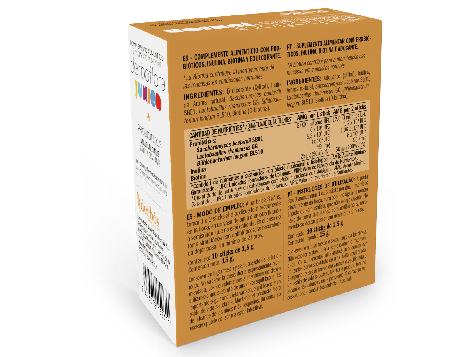- A partir de 3 años, tomar 1 o 2 sticks al día, disuelto directamente en la boca, en un vaso de agua o en otro líquido o semisólido, que no esté caliente. En el caso de toma simultánea con antibióticos, se recomienda dejar pasar un mínimo de 2 horas.