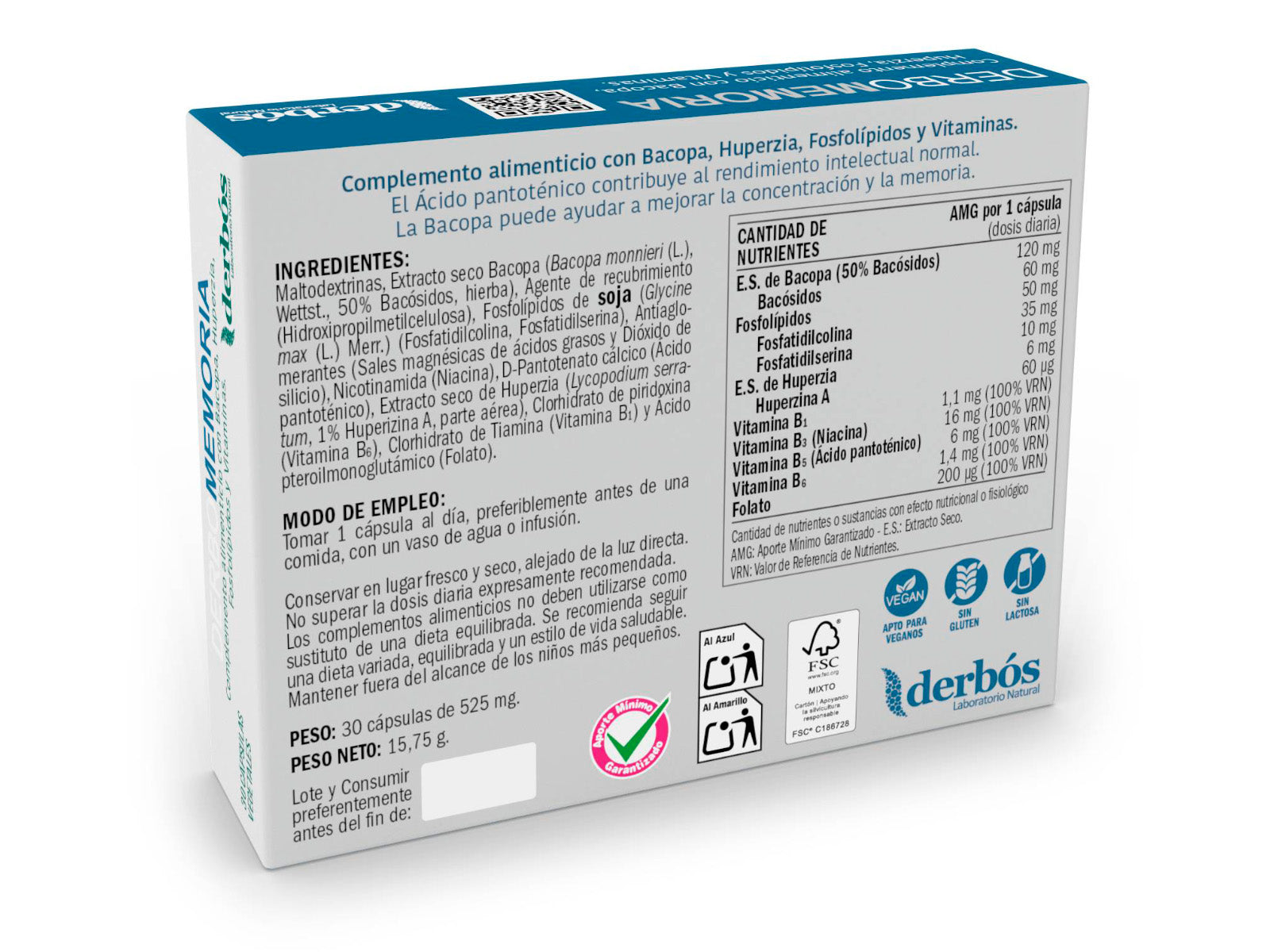 Complemento alimenticio con Bacopa, Huperzia, Fosfolípidos y Vitaminas.